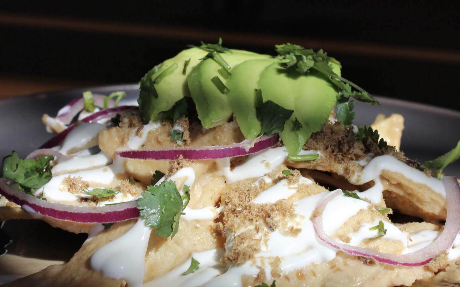 TORTILLA FRITA BAÑADA EN SALSA BLANCA DE HABANERO, QUESO GRATINADO, CARNE SECA MACHACADA, AGUACATE, CREMA, CILANTRO Y CEBOLLA MORADA.